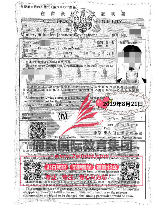 日本留学在留资格认定证明书 / STUDY ABROAD IN JAPAN INTHE QUALIFICATION CERTIFICATE